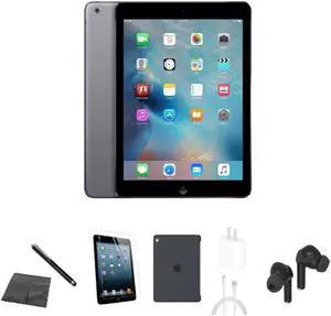 Apple iPad Air A1474 (WiFi) 16GB Space Gray Bundle w/ Case, Bluetooth Earbuds, Tempered Glass, Stylus, Charger