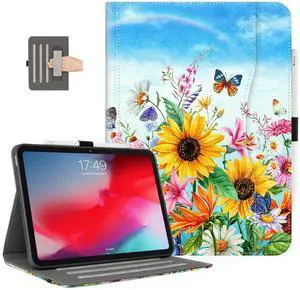 Case for iPad (A16) 11th Generation 2025, iPad 10th Generation Case with Pencil Holder Multi-Angle Adjustable Stand Shockproof Protective with Pocket/Hand Strap/Auto Wake Sleep, Sunflowers Butterfly