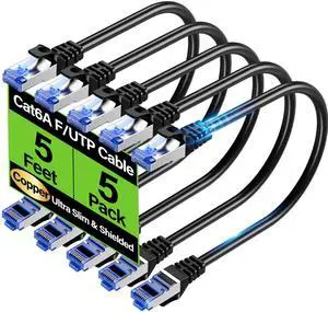 Cat6A Ethernet Cable Shielded 10Gbps 5 ft (5 Pack), Slim Shielded (F/UTP) Ethernet Cable Cat 6, Flexible 28AWG Bare Copper Cat6 Cable, Space-saving Cat 6a Network Cable for Server, Data Center, Black