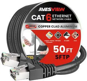 CAT 6 Shielded 50 ft Ethernet Cable, Indoor High-Speed (SFTP) 10Gbps Snagless Shielded Ethernet Cable 50 ft for Internet, Router, Computer, PlayStation, Xbox, POE Camera, Printer - Black