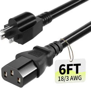 3 Prong AC Power Cord Cable 6ft 10 Amps 125 Volts 18AWG, NEMA 5-15P to C13, Black PC Power Cable for TV, Computer, Monitor, Printer, PlayStation, HP, Dell, Lenovo, Apple, Asus-ETL Listed