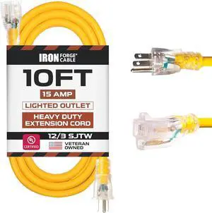 Features: This 10FT power extension cord is made by IRON FORGE CABLE and features a style with iron material. It supports a voltage of 125 volts and an input current of . The cable is Yellow in color and is UL listed. It comes with a Male-to-Female connector and does not require batteries.