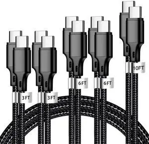 USB C to USB C Charger Cable, 5 Pack [3/3/6/6/10ft] Type C Fast Charging Cord High Data & Transfer Wire Compatible for iPhone 17/16/15 Plus/Pro Max iPad Pro Air Ps5 Controller Samsung Galaxy(Black)