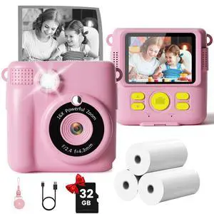 Kids Camera Instant Print - 2.4" Eye-Care Digital Video Camera for Toddlers & Kids Ages 3-12, with 3 Rolls Paper & 32GB SD Card, 1080P, 18 Frames, Birthday for Girls