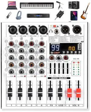 4 Channel Professional Audio Mixer with 4 MIC/LINE Inputs, 5-Band EQ, 99DSP Effects, USB Playback/Recording, +48V Phantom Power for Musicians Live Streaming DJ Podcasting Home Studio(AG-4K)Brand: RXSKERTLSpecification: , RXSKERTL, , , , , , XLR, 1.6 kilograms, , , 52161500, RXSKERTL, , , , , Corded Electric, false, false, 4, 1.61 kilograms, 2 year manufacturer., , , USB, , , , , 10.0076 L x 25.5016 W x 27.9908 H centimeters, 2025-09-27T18:34:41.101Z, not_applicable,Power Supply: Corded ElectricWeight: 1.6 kilogramsModel #: 449026774691