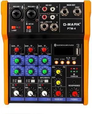 Analog Mixer Audio 4 Channel DJ Audio Mixer Bluetooth Studio Karaoke For PC Live Performance KTV Home Stage Music Effects Sound Card Protable Mixing ConsoleBrand: G-MARKPart Number: PTM-4Specification: , G-MARK, , , PTM-4 Channel, , , XLR, 0.97 kilograms, PTM-4, , 52161500, G-MARK, PTM-4, , 0 L x 0 W x 0 H inches, , Corded Electric, , false, 4, 0.97 kilograms, 1 year warranty., 1, XLR, Interface,Usb,Bluetooth, , 185 millimeters, 155 millimeters, 60 millimeters, 8.3 L x 22.6 W x 23 H centimeters, 2019-06-07T07:00:00Z, ,Power Supply: Corded ElectricModel #: 742220148552