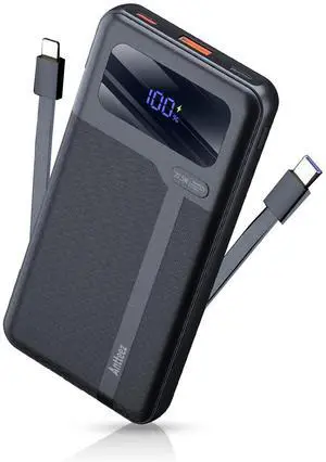 Portable Charger with Built-in Cables and Plug, 10000mAh USB C Power Bank Fast Charging, External Battery Pack Slim, Travel Essentials Compatible with iPhones, Samsung Galaxy, iPad