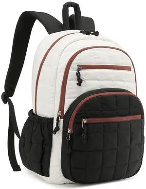 CLOKARS Bookbag for Women, Teen Girls Backpack for High School College Student, Puffer Quilted Back Pack Cute Laptop Backpack for Work Travel Mom Casual Daypack, Beige Black Brown