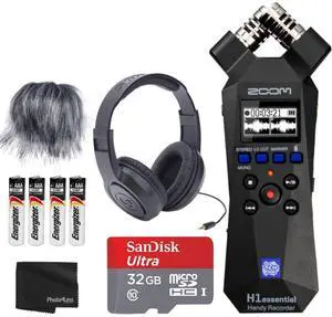 Zoom H1essential Handy Recorder Bundle with Over-Ear Stereo Headphones, 32GB microSDHC Card, Furry Microphone Windscreen, 4 AAA Batteries and Accessories