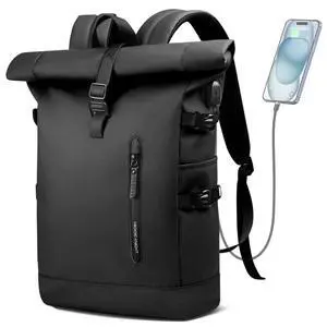 HEROIC KNIGHT Rolltop Backpack, 15.6 Inch Waterproof Laptop Backpack with USB Charging Port, Expandable 18-27L Travel Backpack for Men Women, Casual Daypack for Work Business College-Black