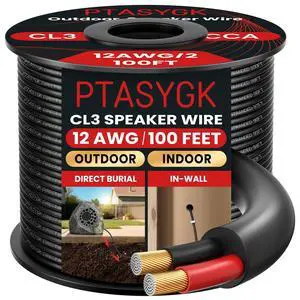 PTASYGK 12 Gague Outdoor Speaker Wire 100 Feet - 2 Conductor Direct Burial Speaker Cables CL3 CL2 Rated, UV Resistant CCA Cable for Garden, Patio, Pool Audio Systems