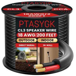 PTASYGK 18 Gague Outdoor Speaker Wire 200 Feet - 2 Conductor Direct Burial Speaker Cables CL3 CL2 Rated, UV Resistant CCA Cable for Garden, Patio, Pool Audio Systems