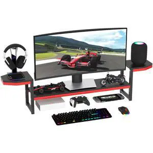 Jotboom Monitor Stand for Desk,Wood and Steel Monitor Stand Riser with Side Storage shelf,Height Adjustable Computer Monitor Stand for Computer/Laptop/PC/Printer, Black+Red