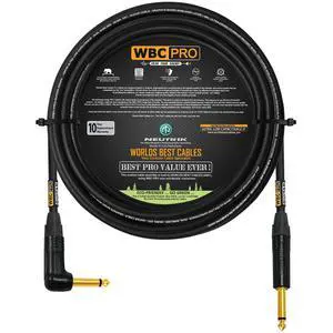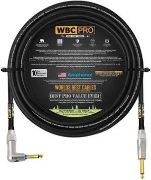 30 Foot - WBC-PRO-Guitar 20 AWG - Low-Cap (18pF/ft) Pro-Grade Graphite-Based - Dual-Shielded Guitar, Bass, Instrument Cable with Neutrik Straight to Angled Inch (6.35mm) Gold TS Connectors