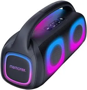 Memorex MX-BTS300 Pump Box Rechargeable Bluetooth Speaker ^^ 20W Portable Speaker with RGB LED Lights, FM Radio, USB/TF Playback, AUX Input & 16-Hour Battery ^^ Wireless Bluetooth 5.0 Speaker