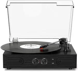 Vinyl Record Player with Built-in Speakers 3-Speed Vintage Record Player Support Treble& Bass Control, 3.5mm Headphone Jack, RCA-Out/Aux in, Belt-Driven LP Turntable,Black Wood