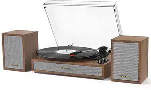 Vintage Vinyl Record Player with External Bookshelf Speakers, 3-Speed Belt Drive Turntable with Auto Stop, Bluetooth Input, RCA Out, AUX in Brown Wood