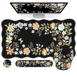 Anyshock Scalloped Desk Cover Mat, Aesthetic Mousepad with Wrist Rest, Memory Foam Wrist Support for Keyboard, Ultra Smooth Mouse Pad for Office Desk Decor, School Supplies (Black)