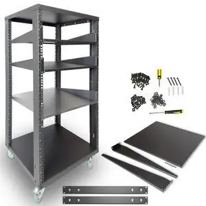 AxcessAbles 22U Open Frame Network & AV Rack with Caster Wheels, Three 2U Shelves, 10-32 & Cage Nut Compatible Rails, Cage Nuts, Screws, Cage Nut Tool & Wall Mount Kit ^^ 19-Inch Equipment Rack