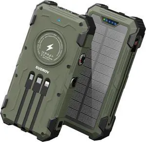 Solar Power Bank 42,800mAh, 15W Wireless Portable Charger with Built-in Cables, Outdoor Solar Battery Pack with LED Flashlight, Fast Charging for iPhone, , iPad etc