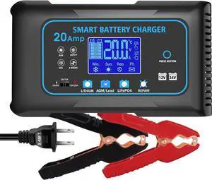 20 Amp Smart Battery Charger, 12V/20A and 24V/10A Car Battery Charger, Trickle & Maintainer Pulse Repair for Lithium, Lifepo4, Lead-Acid (AGM/Gel/SLA), Boat, Motorcycle, Golf Cart, Tractors