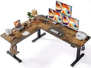 75" L-Shaped Electric Standing Gaming Desk with Power Outlets, Height Adjustable Corner Desk with Cable Management & Side Hooks, Rustic Brown