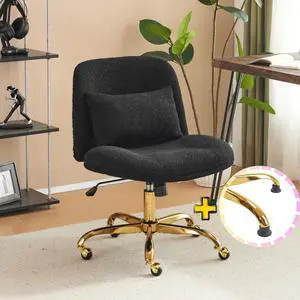 VINGLI Wide Criss Cross Legged Office Chair,Buttprint Ergonomic Desk Chair Comfy with Pillow&Gold Base,Dual-Use with/no Wheels,Adjustable Vanity Swivel Chair for Bedroom,Home Office,Teddy Fleece,Black