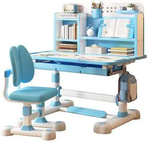 Upgrade Kid Desk and Chair Set, 50-Degree Tiltable Desktop Height Adjustable Kids Table and Chair Set with Bookshelf Storage Drawer for Bedroom Study Room (Blue B)