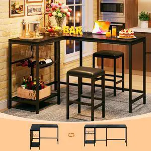 Bar Table and Chairs Set for 2-4, 3-Piece Convertible L-Shaped Dining Set with Storage Shelves & Cup Holder & Wine Rack, 63'' Corner Kitchen Table Set with 2 PU Cushion Stools & Power Outlets, Black