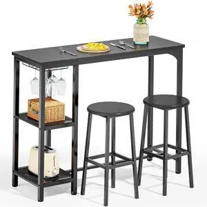 Small Bar Table Set for 2, Bar Table and Chairs Set for 2, Kitchen Table for 2 with 2 Storage Shelves & Wine Glass Holder, Dining Table for Small Apartment, Dining Room, Black