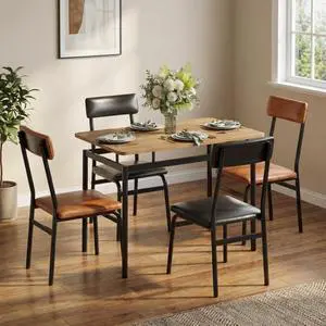 Dining Table Set for 4 Wooden Kitchen Table with 4 PU Upholstered Chairs, Industrial Metal Frame Kitchen & Dining Set for Home, Apartment, Studio, Black