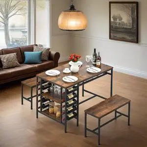 47" Dining Table Set for 4, 3 Pieces Kitchen Table Set with 2 Benches, Wine Rack and 2-Tier Storage Shelves, Space-Saving Breakfast Table Set for Apartment, Rustic Brown