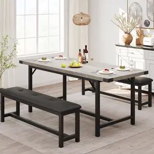 3-Piece Dining Table Set for 4-6 People, Extendable Kitchen Table Set with 2 Upholstered Benches, Dining Room Table Set for Apartment, Kitchen, Living Room, Gray