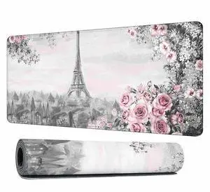 Y YIHANGBEST Paris Eiffel Tower Mouse Pad Desk Mat Love Pink Roses Flower Valentine's Day Large Gaming Mousepad for Keyboard PC.Home,Office 35.4"X15.7"