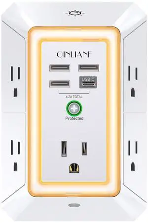 3-Sided Outlet Extender with Night Light - QINLIANF Multi Plug Outlet with 5 Outlets and 4 USB Ports(1 USB-C), USB Wall Charger for Home, Office, Travel, ETL Listed, White