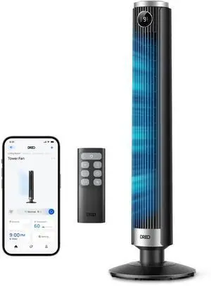 Smart Tower Fan for Bedroom, 40-45 Adjustable Height, 28 ft/s Velocity, DC Motor, 9 Speeds, 4 Modes, 90°Oscillating, Standing Fan, 20dB Quiet, 12H Timer for Home, Office, Google/Alexa, Black