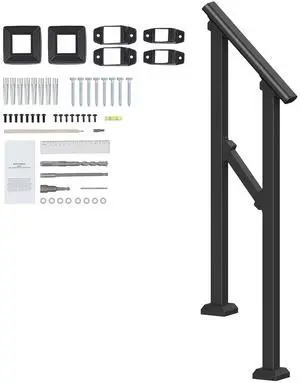 Handrails for Outdoor Steps, 1-2 Step Stair Hand Rail Kit, Transitional Carbon Steel Railings with Installation Kit, Stair Rails for Seniors, Concrete Steps & Porch & Deck, Black Square Tube