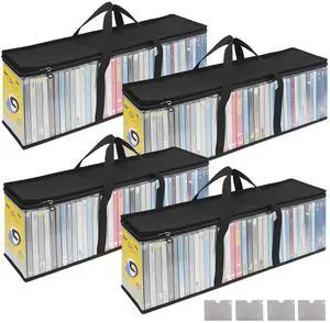 Klmnop DVD Storage Bags (Set of 4), Clear Media Organizer Bag with Handles and Label Holders, Water Resistant PVC CD Storage Zipper Case Each Holds up to 40 DVDs/CDs/Video Games Discs(Black)