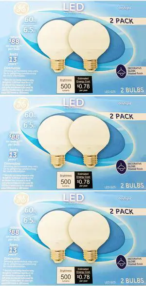 (6 bulbs) GE 37274 LED Globe, G25, 60 watt equivalent, medium base, Frosted, Dimmable, refreshing Daylight LED bulbs