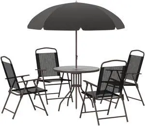 6 Piece Patio Dining Set for 4 with Umbrella, Outdoor Table and Chairs with 4 Folding Dining Chairs & Round Glass Table for Garden, Backyard and Poolside, Black