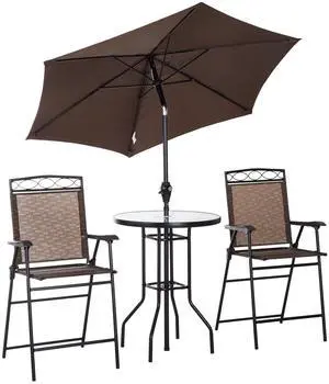 4 Piece Outdoor Patio Dining Furniture Set, 2 Folding Chairs, Adjustable Angle Umbrella, Wave Textured Tempered Glass Dinner Table, Brown