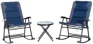 3 Piece Outdoor Patio Furniture Set with Glass Coffee Table & 2 Folding Padded Rocking Chairs, Bistro Style for Porch, Camping, Balcony, Navy Blue