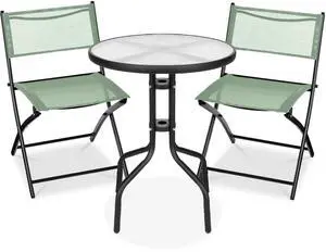 Best Choice Products 3-Piece Patio Bistro Dining Furniture Set w/Textured Glass Tabletop, 2 Steel Folding Chairs, Polyester Fabric - Sage
