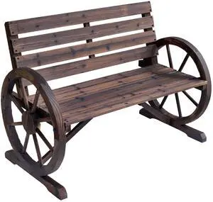 41" Wooden Wagon Wheel Bench, Rustic Outdoor Patio Weather Resistance Furniture, 2-Person Slatted Seat Bench with Backrest, Carbonized
