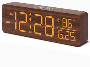 Wooden Digital Alarm Clocks for Bedrooms Large Display Desk Clock with Date & Day of Week for Living Room, Temperature, Dimmer, Adjustable Volume, Auto DST, Office Wood Décor (Plug-in)