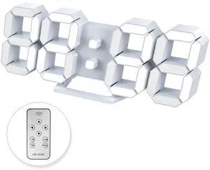 Led Digital Alarm, 3D Wall Clock Desk Auto Dimming 12/24 Hour Date Temperature Home Decor Remote Control Silent Snooze USB Nightlight Bedroom Living Room Kitchen Office 9.7inch Cool White