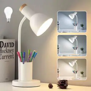 Rechargeable Small Desk Lamp for Home Office Bedroom, Study Table Light for Kids Teens, White, LED, Pen Holder, Mini, Gooseneck, College Dorm Room Lighting for Computer Keyboard Desktop Task