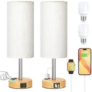 r Bedside Table Lamp with USB Port - Touch Control for Bedroom 3 Way Dimmable Nightstand Lamp with Flaxen Fabric Shade for Living Room, Dorm, Home Office, Wood-Grain (LED Bulb Included)