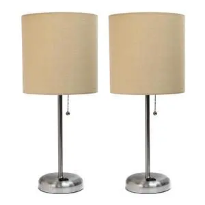 LT1144-TAN-2PK 19.5" 2-Pack Sleek and Slender Brushed Steel Table Lamp with Charging Outlet, for Bedroom, Living Room, Entryway, Office, Dining Room, Study, Tan Shades