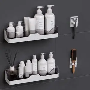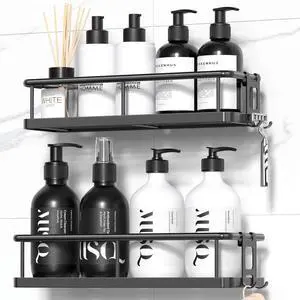 2-Pack Adhesive Shower Caddy, Shower Shelves with Hooks, No Drilling Shower Racks for inside shower & Kitchen Storage
